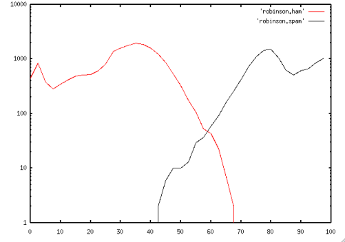 In this plot, you can see that most of the spam gets scores near to 100, while most of the ham gets scores near to 0. This is all good. Unfortunately, there's also a significant number of hams that score close to 100, and spams close to 0 - which means the system is not just scoring them wrong, but it's completely confident in its (wrong) score. (Note that the difference isn't as apparent as it could be - it's a logarithmic scale graph!) Gary Robinson's essay turned up around this time, and Gary turned up on the mailing list a short time after that. Gary's initial technique produced scoring like this plot: